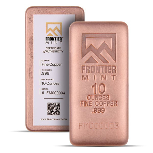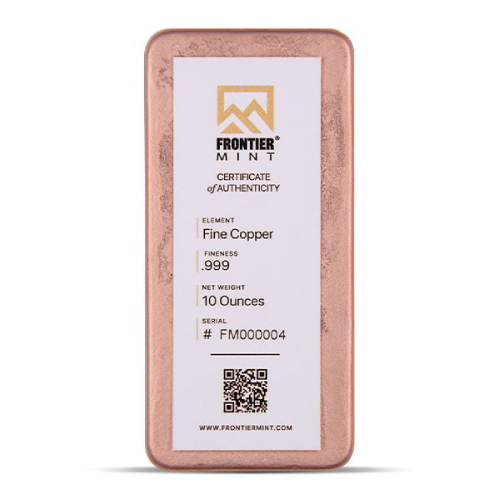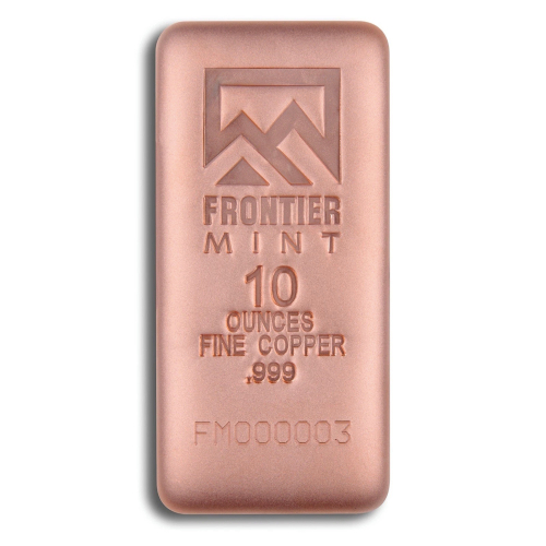 The Frontier Mint 10 oz Copper Bar is a premium bullion piece composed of .999 fine copper and weighing 10 standard avoirdupois ounces.