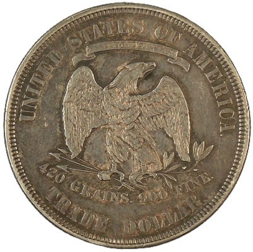 United States Trade Silver Dollars were minted from 1873-1885. These coins were issued solely for circulation in the Orient to compete with dollar sized coins from other countries. Trade Dollars weigh slightly more than a standard U.S. silver dollar, and many of the examples that circulated in the Orient were counter-stamped with characters known as "chop marks." The "chop marked" coins generally bring less than the normal examples we offer here. Trade Dollars were struck at three mints: Philadelphia, San Francisco and Carson City. Examples minted from 1879 to 1885 were struck in proof format only. The 1884 and 1885 dated Trade Dollars are extremely rare and are considered two of the rarest United States coins.