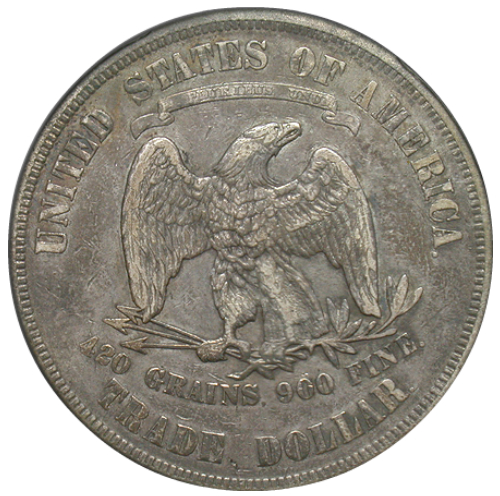 United States Trade Silver Dollars were minted from 1873-1885. These coins were issued solely for circulation in the Orient to compete with dollar sized coins from other countries. Trade Dollars weigh slightly more than a standard U.S. silver dollar, and many of the examples that circulated in the Orient were counter-stamped with characters known as "chop marks." The "chop marked" coins generally bring less than the normal examples we offer here. Trade Dollars were struck at three mints: Philadelphia, San Francisco and Carson City. Examples minted from 1879 to 1885 were struck in proof format only. The 1884 and 1885 dated Trade Dollars are extremely rare and are considered two of the rarest United States coins.