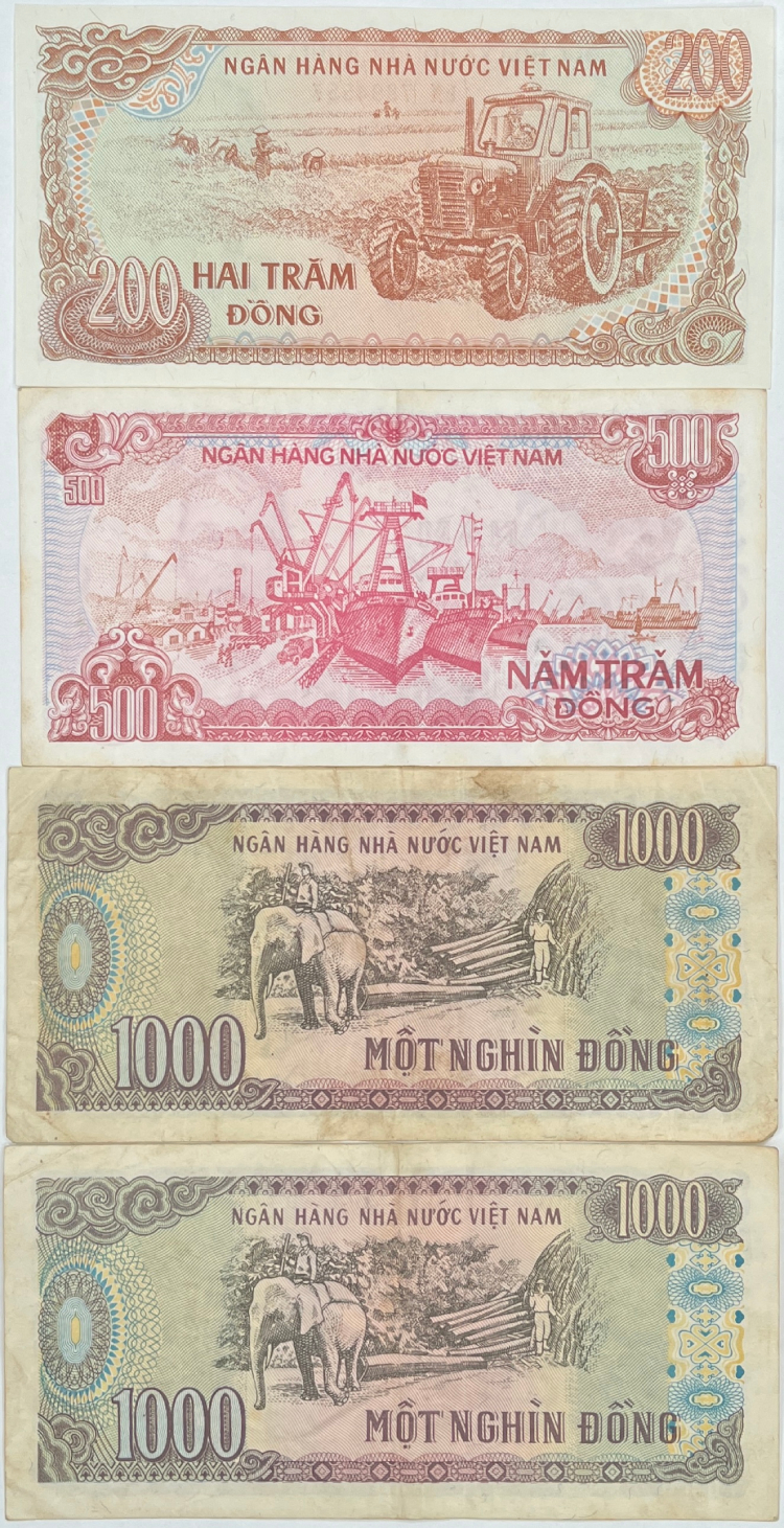 Lot of 4 Vintage 1980's Vietnamese Dong Bank Notes - 200, 500, 1000 Denominations Lot of 4 Vintage 1980's Vietnamese Dong Bank Notes - 200, 500, 1000 Denominations