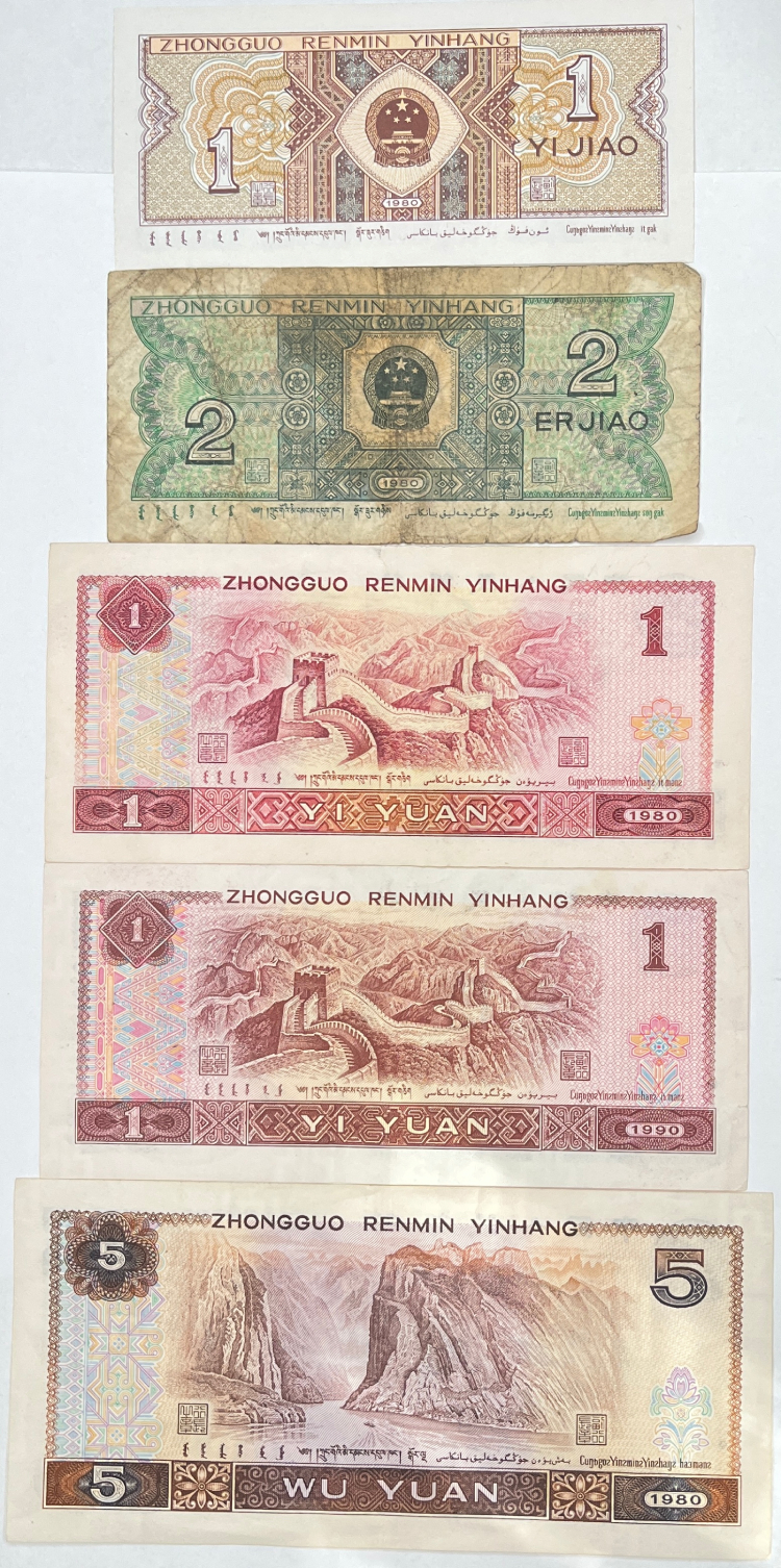 Lot of 5 Vintage People's Bank of China Banknotes - 1 and 2 Jiao - 1 and 5 Yuan